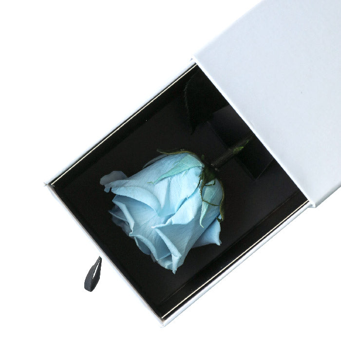 A Beautiful Baby Blue Preserved Single Rose Stem in a luxury gift box that lasts 1 year or more with no maintenance .