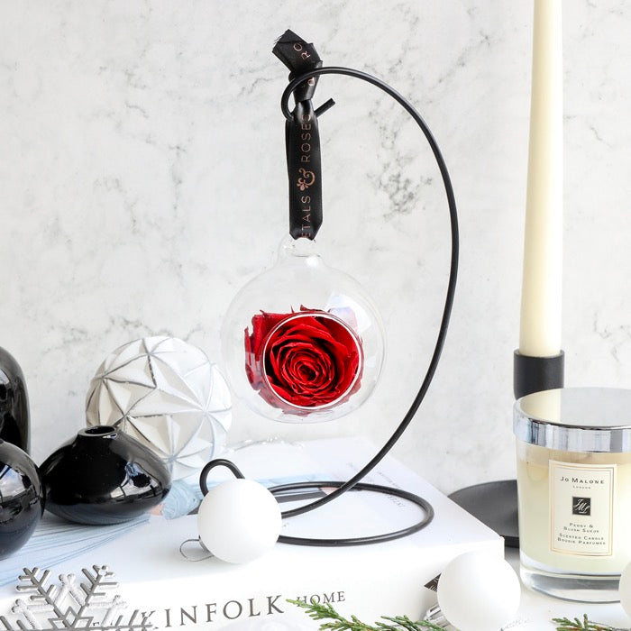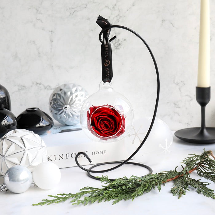 A stunning real preserved Red Rose held within an open glass sphere with a stand to complete your home decor.
