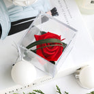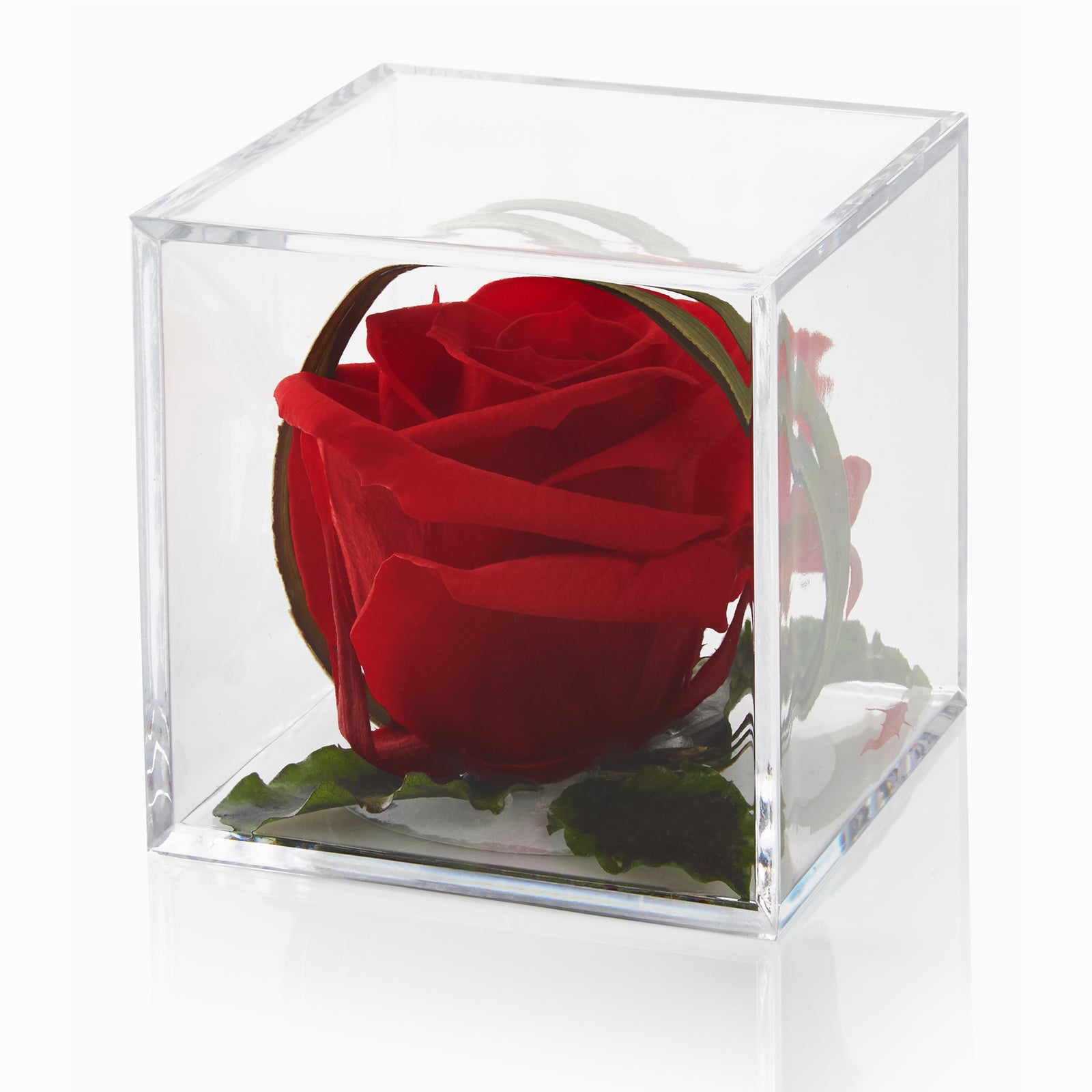 This beautiful Eternal Red Rose Cube contains a real red rose that has carefully been preserved to hold its stunning colour and iconic shape for up to a year with no need to water or maintenance.