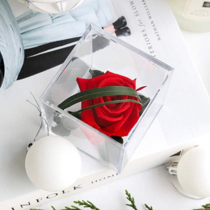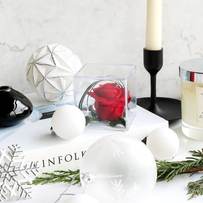 Arrives to you in a clear cube to protect the red rose and avoid getting dust on the rose over time too. Each cube comes in a white gift box, tied with a black ribbon.