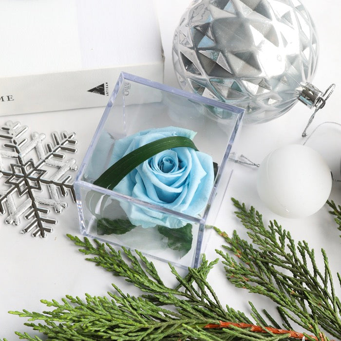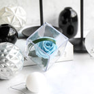 This beautiful timeless single baby blue cube rose is a stunning gift that will maintain its beauty for up to 12 months with no watering or maintenance required.