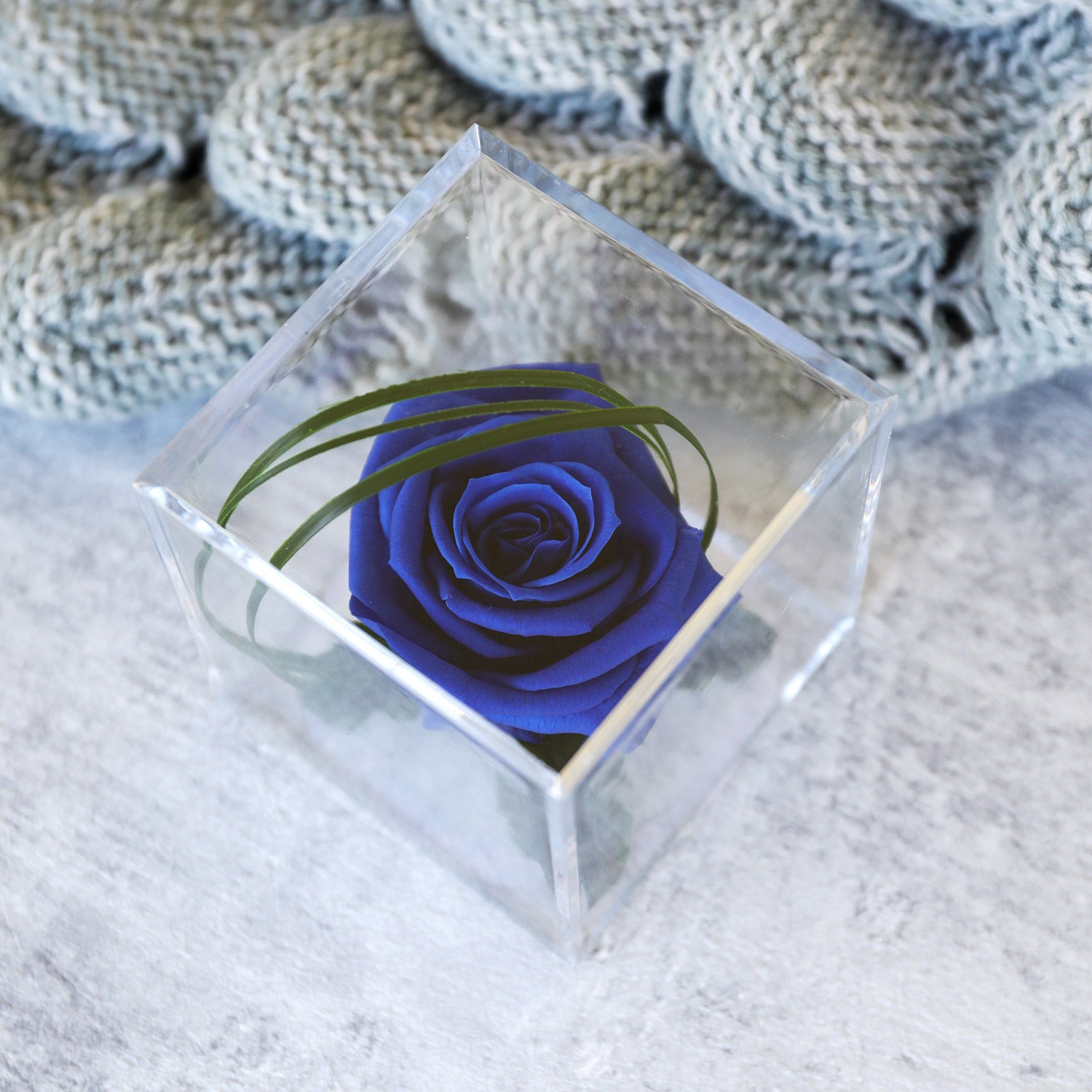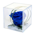 This Blue Timeless Rose Cube arrives to you in a clear cube case to allow its natural beauty to show through whilst keeping the rose’s elegant style. The rose cube is packaged in a beautiful white gift box and finished with a hand tied black satin ribbon bow.