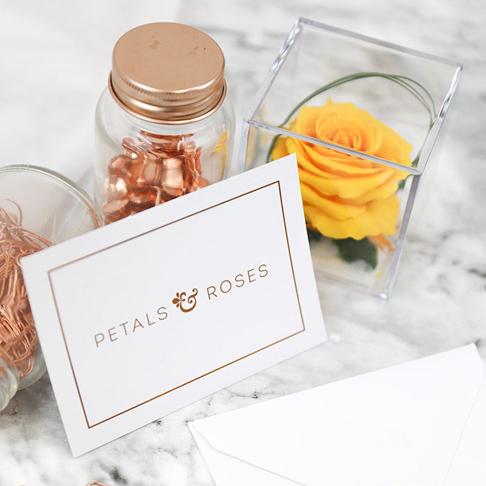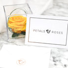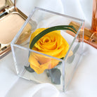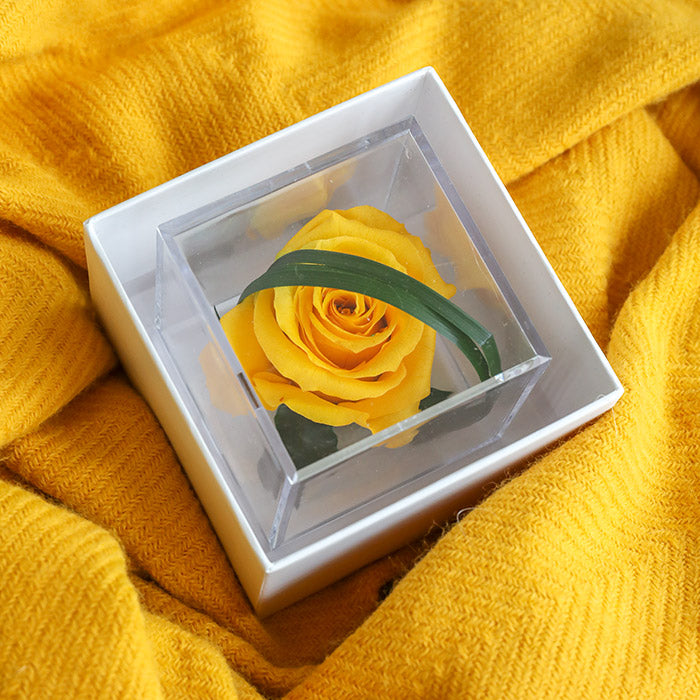 This Yellow Eternal Rose Gift arrives to you in a clear cube case to allow its natural beauty to show through whilst keeping the rose’s elegant style. The eternal rose cube is packaged in a beautiful white gift box and finished with a hand tied black satin ribbon bow.