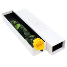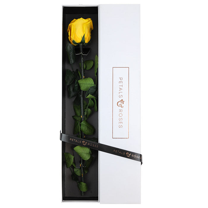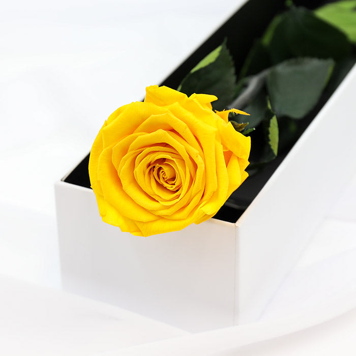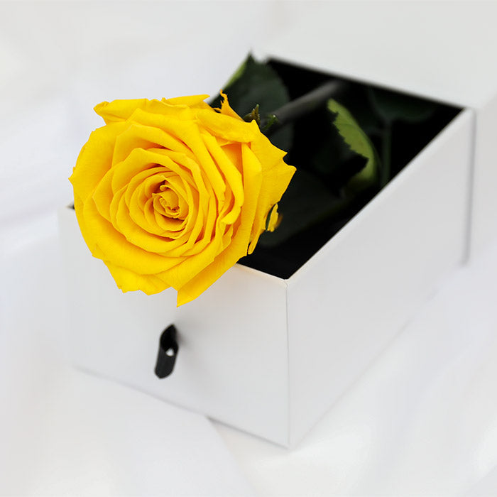 A Charming Yellow Eternal Rose Stem in a luxurious white and rose gold gift box.