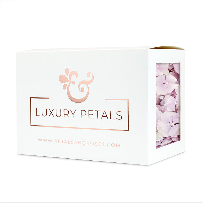Lilac is made from real hydrangea flower petals which are freeze dried to keep their stunning colour and shape. These petals will arrive to you in a luxury white display box.