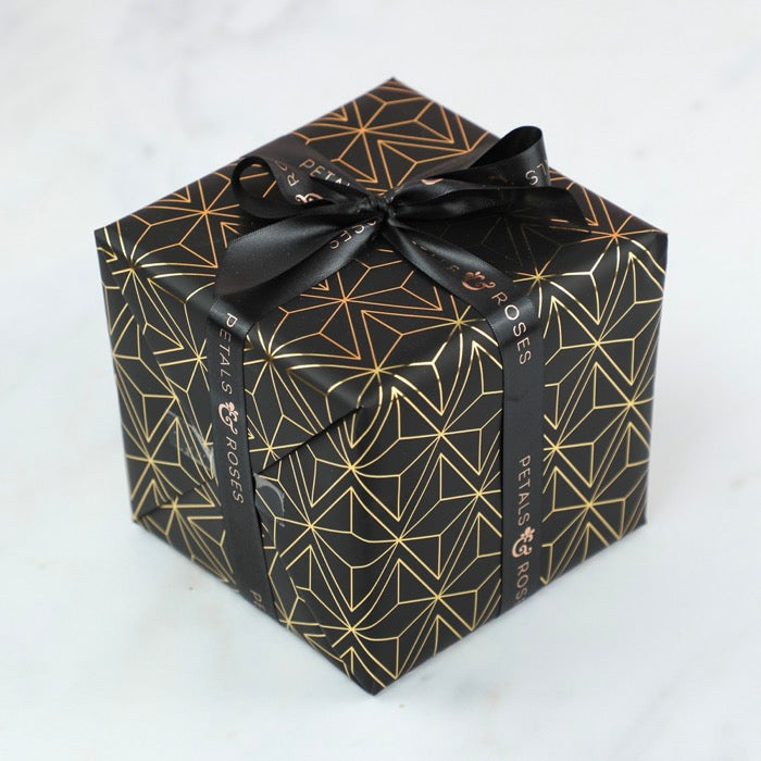 This stunning black rose comes with a modern black metallic stand and beautiful rose gold detailed ribbon to hang your forever rose from. Place it on a makeup table, bedside table or sideboard to admire for months and years.